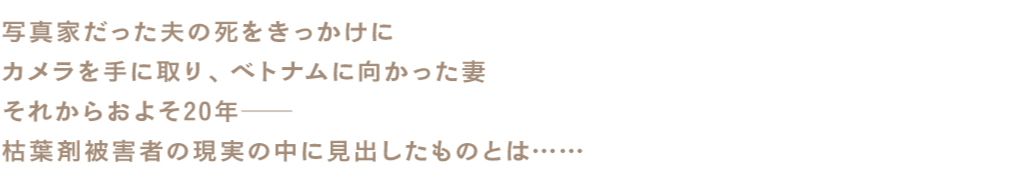 その理由がベトナム戦争時の枯葉剤にあるのではと聞かされた妻・坂⽥雅⼦は夫の⾝に起こったことを知りたい⼀⼼でカメラを⼿に取り、ベトナムへ向かった。そこで⽬にしたのは戦後 30 年を過ぎてなお、枯葉剤の影響で重い障害を持って⽣まれてきた⼦どもたちと、彼らを愛しみ育てる家族の姿だった。